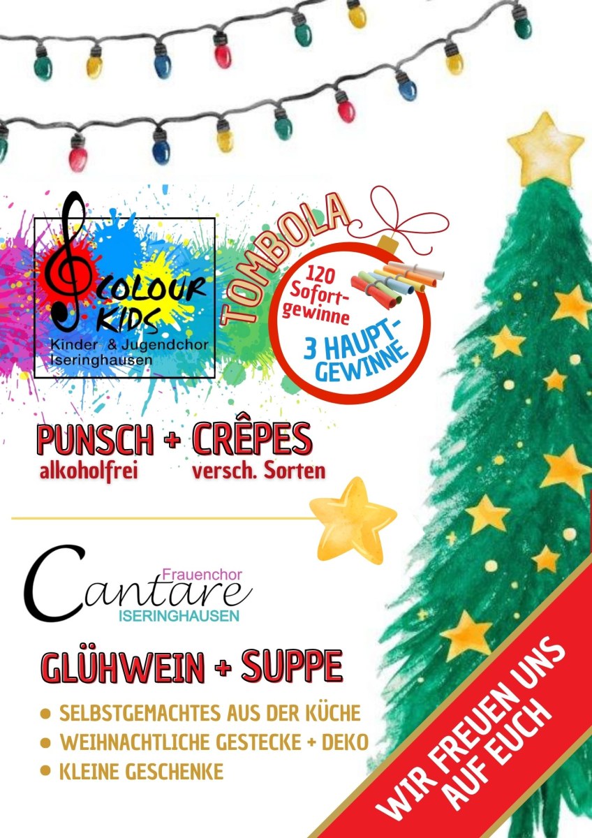 Am 1. Advent veranstaltete der Dorfverein „Sympathisches Iseringhausen“ einen heimeligen Weihnachtsmarkt. Viele Vereine waren mit einem Stand vertreten, so auch die ColourKids. Punsch und Crepes fanden reißenden Absatz und auch die Tombola kam gut an. Alle drei Hauptpreise gingen an ColourKids-Familien, was uns natürlich besonders freut.